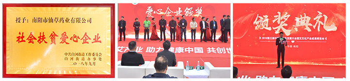 公司為白河街道貧困戶捐助30萬元,做為股金入股企業,年分紅利3萬元,由街道辦事處為貧困戶購買公益性崗位和做為貧困戶收益,為貧困戶提供更加有效的就業保障。提高貧困戶收入。2018年10月16日舉行隆重的授牌儀式,會上市領導對南陽仙草藥業有限公司的扶貧工作給予高度贊場和肯定,并鼓勵其他企業向仙草藥業學習。